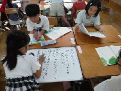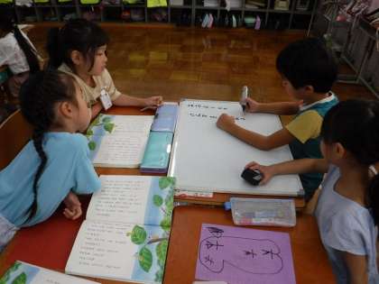 友達の意見を聞き、記録係がホワイトボードに上手に書いていました。