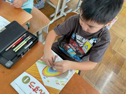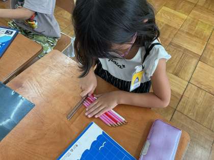 「おおきさくらべ」の学習で、鉛筆やノート、ひもなど、様々な形のものをどうやって比べればよいか考えました。