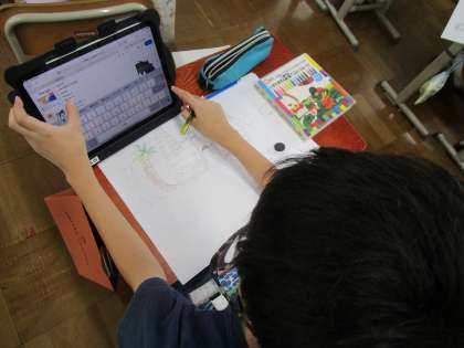 図画工作科では「言葉から思いを広げて」の単元に取り組んでいます。1冊の本から想像を膨らませて、絵に表しています。全体像を描き、細部をどう表現するか試行錯誤しながら描き進めています。