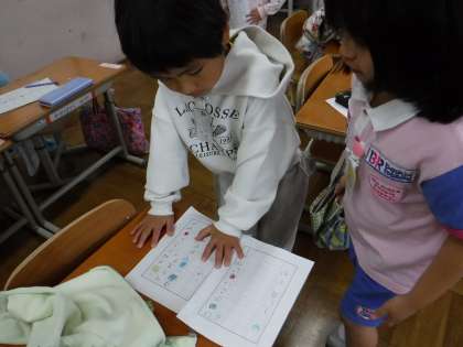 国語科「かん字のはなし」の学習を生かして作った漢字クイズを、友達同士で交流しました。新しく学習した漢字の成り立ちを絵や印で表し、どの子も楽しんでいました。