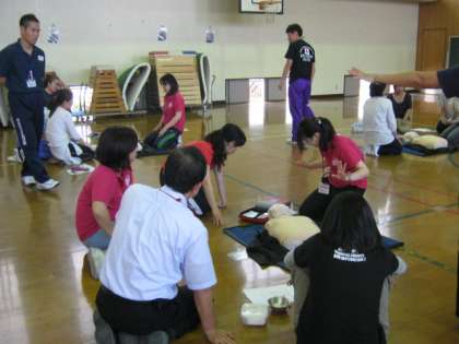 日本赤十字社京都府支部の方にお世話になり,教職員と保護者の方々とで救命救急法の研修をしました。水泳学習が始まったこともあり,緊急時に備えて真剣に取り組みました。