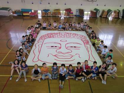 社会科の奈良時代の学習で奈良の大仏についての学習をしました。その一環として,実物大の大仏を作って大きさを感じてみようということになりました。さすがに全体は無理なので,顔だけを平面で作ることになりました。顔だけと言っても縦が4,7mもあります。教室いっぱいくらいの顔になります。大仏の顔を切り分け,グループで分担して紙に描いていきました。子どもたちはどの部分を描いているのかわかりません。それを裏向けに間違えないように貼り合わせました。貼り合わせたものを一気に表に向けたときには子どもたちから歓声が上がりました。最後に担任が目を入れ,無事「大仏開眼式」を終えることができました。みんなで大仏の大きさを感じ,仏教を重んじた当時の人々気持ちの深さを感じました。記念撮影をしました。作った大仏は6年生教室前廊下に展示し,6年生の学習の様子を見守っています。前を通るとかなりの迫力です。先日の自由参観ではたくさんの保護者の方がご覧になられたことと思います。しばらく掲示していますのでぜひご覧いただけたらと思います。