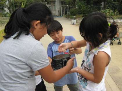 9月9日 2:05から,4・5年生でみさきの家で経験する「野外炊事の実習」を行いました。昼休みの間から,ごはん係が飯ごうに米を入れて洗って用意しました。その間,かまど係がブロックを積み上げて準備していきました。