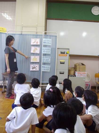 その後,うんちのはなしを養護の植田先生から聞きました。最初に,「みんなのうんち」という絵本で,「食べ物をたべたらみんなうんちがでるんだよ」「いろいろな動物もいっしょだよ」ということが分かりました。次に,うんちの種類についてお話を聞きました。4つにわけられて,自分の体調を知るための大事なものであることも学習できました。