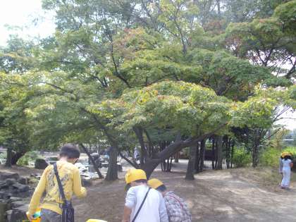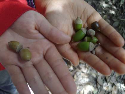 梅小路公園へ秋見つけに行きました。まず,わずかではありますが,少し色づき始めた紅葉を見つけ,驚きました。また,落ち葉の下から,まだみどり色のかわいいどんぐりをたくさん見つけました。他にも,コオロギやザリガニ,ハサミムシなどの生き物も探すことができました。宝物をさがすかのように,みんなで競い合って探していました。