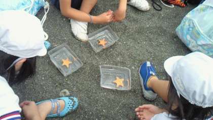 まず、ヒトデの実験をしました。初めてヒトデを触った人も多く、不思議な動きに魅了されていました。