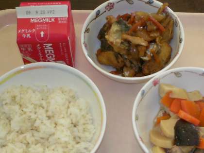 『麦ごはん・牛乳・あじの南蛮風・高野豆腐と野菜のたきあわせ』です。