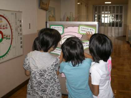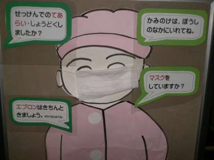 給食当番の身じたくを確認するため,給食室のサービスホールに入る前に人形(紙で作った)を掲示しています。お家でも,当番のマスクやタオル等の準備をよろしくお願いいたします。