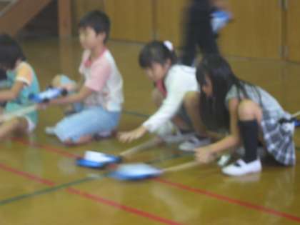今 3年生では,理科学習で「風やゴムのはたらきをしらべよう」の学習をしています。風の強さやゴムの強さをかえて車を走らせて実験をしています。「強い風のほうがよく進むよ。」「ゴムを長く伸ばすほうが遠くまで進むよ。」など実験しながら,自分の考えをつくっています。
