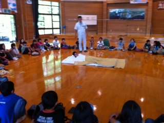 所員の方に寝具のたたみ方を教えてもらいました。全員真剣に話を聞いていました。