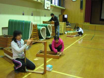 準備も後片付けも子どもたちでしています。子どもたちが跳び箱を持ったときにとげが刺さらないように,放課後に,やすりで教員が「跳び箱みがき(とびばこの角を磨く)」をしました。「子どもたちはどこを持つかな。」「とげが刺さらないように磨けたかなあ。」と確かめながら磨いていきました。