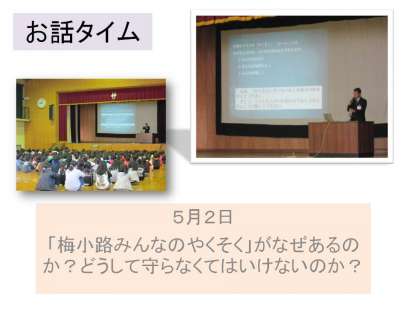 まず,お話タイムで校長先生から「梅小路みんなのやくそく」をもとに「約束がなぜあるのか」「どうして守らなければいけないのか」などお話を聞きました。