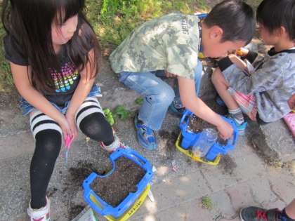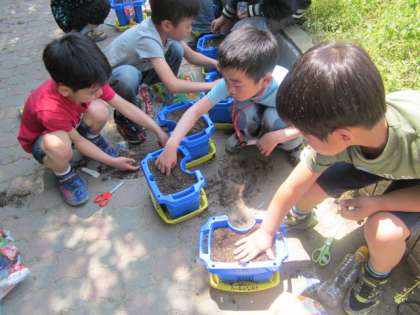 みんな一人ずつ鉢に植えたので,お父さんお母さんの気分で毎日の水やりを頑張っています。水やりにいっては,「まだかな。」「ちょっとでてきたかも。」とあさがおの変化を気にかけています。