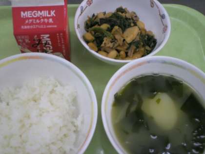 今日の献立は,「ごはん・牛乳・肉みそいため・わかめスープ」でした。肉みそいためは,大豆やほうれん草を使い,鉄分たっぷりのおかずです。わかめスープには,トックというおもちが入っています。