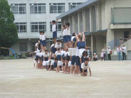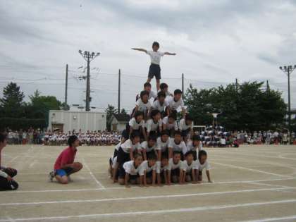 演技後半。5年生に波を作ってもらい,その中に堂々とそびえる橋を39人で表現しました。男子51人・女子39人のそれぞれのピラミッドも見事に成功!最後は,4本のタワーを立てるという大きなチャレンジにも挑み,見事に成功させることができました。
