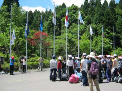 花背峠を通り,予定通り花背山の家に到着しました。玄関前まで荷物を持って歩き,司会の係の進行でけじめ良く入所式をしました。入所式の後,宿舎に荷物を置いて、玄関前の芝生近くでお弁当を食べました。