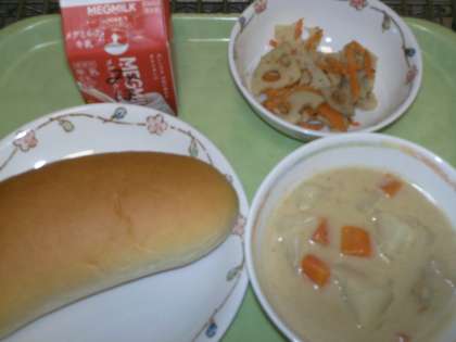 今日の献立は,「ミルクコッペパン・牛乳・かぶらのクリームシチュー・れんこんのソティ」でした。聖護院かぶらを使い,とろろけるような口当たりに仕上がりました。れんこんのソティも皮をむくのに時間がかかりましたが,歯ごたえよくシャキシャキとできあがりました。冬野菜をつかったあたたまる献立でした。