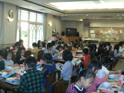 今日は,1年1組と4年1組の交流給食でした。ランチルームでお誕生月ですわり,給食をいただきました。4年生からのクイズの後,1年生にプレゼントもありました。。星のクラフトでうらに「かんしゃしてもりもり食べよう」という言葉が書いてありました。