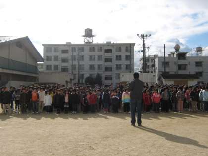 準備の音楽に合わせて教室から運動場に集合した子どもたちは,スタートの位置を確認したり走るコースを実際に走ったりしました。