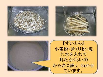 今日の『すいとん』には,「鶏肉・ごぼう・にんじん・しめじ」が入っています。