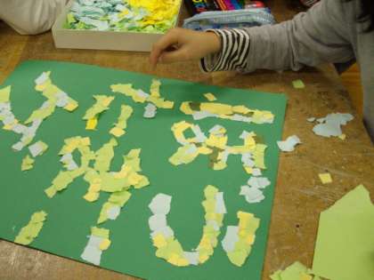小さな巨匠展が,いよいよ来週28日から始まります。21日は,それに向けての合同作品作りをしました。前回みんなが作った板を並べて滑り台ができました。今回はそれに葉っぱの飾りをつけたり,看板や滑り台のゴールを作ったりしました。みんな作業に集中して遊ぶ時間がなくなるほどでした。楽しいコロコロゲームの名前は,「ぼうけんたまころがしゲーム」です。みんなでいろんな名前を出し合って決めました。