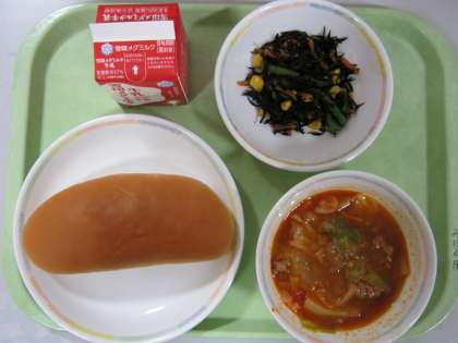 今日は新献立「ミートボールとキャベツのトマト煮」