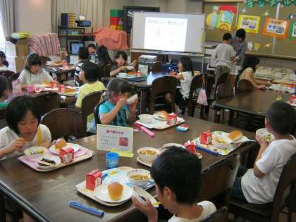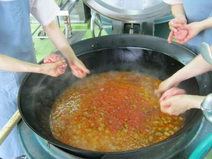 牛ひき肉と豚ひき肉,たまねぎをよくこねて,ひとつひとつ手で丸めてミートボールを作りました。春に,おいしいキャベツをたっぷり使った献立に,子どもたちも大喜びでした。
