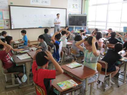 今日の5年生は,先生の自己紹介のあと,英語の簡単な挨拶を使ったゲームで楽しみました。