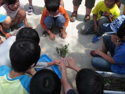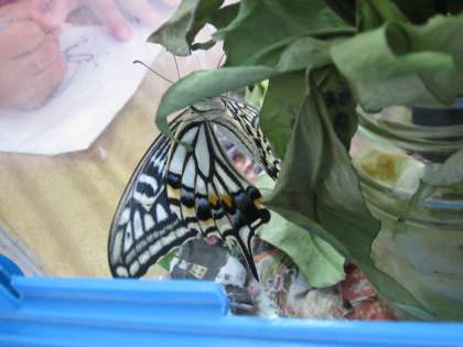 羽化したチョウをどうするかをクラスで話し合った結果,かごの中だと狭いしお花もないのでかわいそうという意見もあり「逃がしてあげよう!」ということになりました。せっかくチョウになったところだったので,さみしいようでしたが「元気でね!」とチョウとさよならをしました。