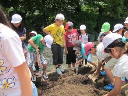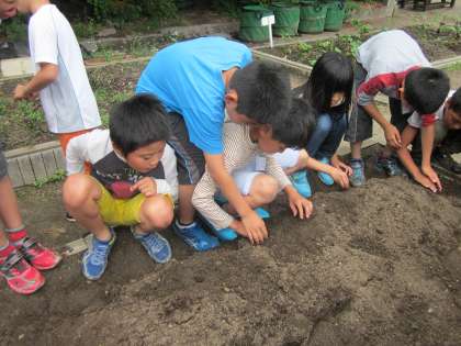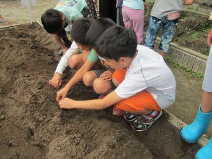 理科の時間にツルレイシの種を植えました。一人一粒ずつ,4年生の花壇に丁寧に植えました。「大きく育ってね。」と声をかけながら土をかけていました。しっかりお世話を続けて大きく成長してほしいと願っています。また,ツルレイシの成長日記もお届けしたいと思います。