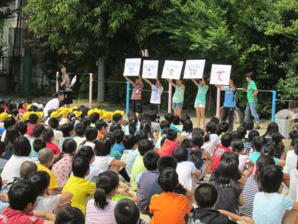 授業時間中に理科室から出火したという想定で,担任の指示に従い,運動場に避難しました。その後,緊急下校をしなくてはならなくなった場合に備え,町別に整列(学校待機児童は別に整列)し,また,自宅以外の場所に下校する児童は,帰る場所の町別の列に移動しました。先生達の指示をよく聞いてすばやく行動でき,避難にかかった時間も昨年に比べて短縮できたようです。