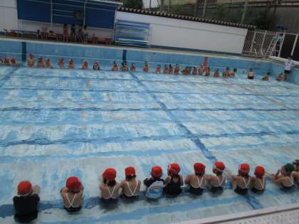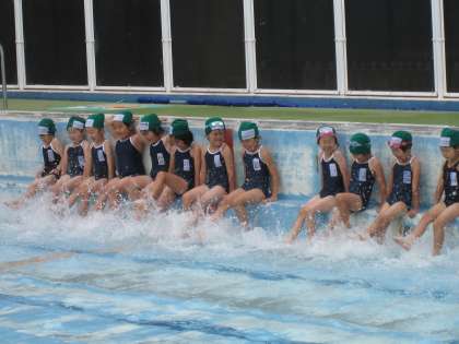 水泳学習のきまりを学び,水に顔をつけるような水慣れや簡単な遊びをしました。来週になると,水の量が少し増えます。楽しく安全に学習を進めていきます。