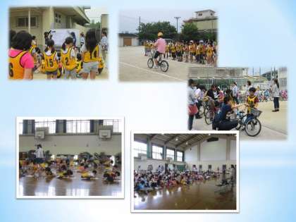 低学年は,体育館でDVDを見たりお話を聴いたりしたあと,校庭に出て自転車の点検の仕方や乗り方の学習をしました。