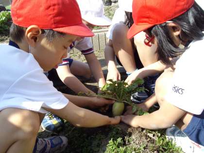 2月26日(金)に収穫した大根と人参の入った味噌汁を作りました。小ぶりなものが多かったのですが,大事に皮をむいて包丁で切った後,お鍋に入れました。当日の夜には,夕飯の話題になったことと思います。お味噌汁が苦手な子も,自分達が育てた野菜だったせいか,「いいにおい。」「おいしい。」「やわらかいね。」など,特別においしく感じました。
