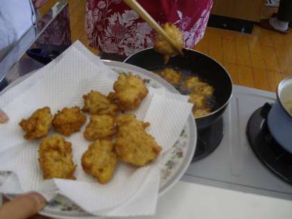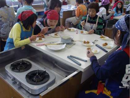 2月24日,食育指導員の方に来ていただき,「さつまあげ作り」をしました。子ども達が家庭科室に行くまでに,タラ1匹をさばいてすり身にしてもらっていたので,調味料を入れて混ぜる段階からスタートしました。子ども達にはさばくところから見せたかったのですが,時間がありませんでしたので,写真に撮っておいてもらいました。「1匹の魚がこのすり身になり,それを揚げるとさつまあげになる」ということを理解させたかったからです。すり身に混ぜた調味料は塩と砂糖です。さらに卵白を加えて,手で混ぜていきました。浮粉と呼ばれるつなぎの粉も混ぜて,いよいよ揚げていきます。「揚げ物は初めて」という子ども達も多かったのですが,すり身をスプーンですくって入れる作業がおもしろいらしく,どんどん揚げていきました。色も形も様々でしたが,それが手作りのよさだと思います。1人2つのさつまあげを作りました。1つは揚げたてそのままを,もう1つはダシに大根おろしを入れたものにつけて食べました。大根は6年生の学級園で育てたもので,さつまあげを揚げている最中に抜いて大根おろしにしました。たいへんおいしかったです。その後は,食育指導員の方々と一緒にランチルームで給食を食べました。さつまあげを教えていただいたお礼に,今度は子ども達がおもてなしをする番です。グループごとに質問を考えたり,話題を作ったりしていましたので,いい雰囲気で交流ができました。この学習は総合の単元「生きる」の一環でしたから,食育指導員の方々に6年生への一言メッセージをお願いしました。「食べることに興味をもって」「親の手伝いをしっかりして」「自分でも作ってみて」「好き嫌いをせず色々なものを食べて」など,人生の先輩としてのメッセージをいただきました。4年生から続けてきている食育の学習もこれで終わりです。てきぱきと準備や片付けをしたり,上手に包丁を使ったりなど,実習の技術は大きく向上しましたし,食に対する意識も大きく変わりました。4年生での「魚の学習」,5年生での「マイお箸作り」,「食習慣の学習」,「手作り味噌作り」,6年生での「麺の学習」,そして今回の「さつまあげ作り」と,様々な活動を通して学んだことがたくさんありました。また,学級園でも多くの作物を収穫し,調理をしてきました。ゴーヤを使ったジュース,ゴマ,ニンジン,ゴボウを使ったきんぴらごぼう,ジャガイモを使ったじゃがバター,そして今回の大根など,自分達で育てたものを使って調理をすることを通して,自然の営み,豊かさを実感できたのではないでしょうか。「食べること」は一生続きます。もっともっと「食べること」に興味をもって,学びを続けていってほしいと思います。