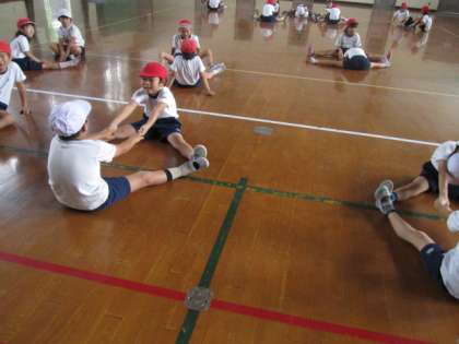 2人組でのストレッチをしたり,大根抜きをしたり,リズムステップをしたりたくさんの