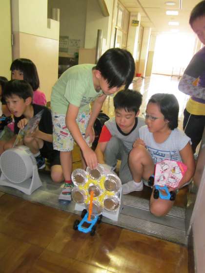 理科で,風やゴムのはたらきについて学習しました。学習したことを生かし,どんな車にすれば長く走ることができるかを考えました。クラスみんなで大盛り上がりでした。