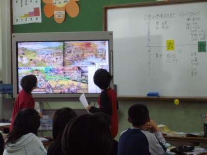 電子黒板を活用して,社会科の学習を見ていただきました。資料を基に子どもたちは様々なことに気付き,学習課題も生まれました。