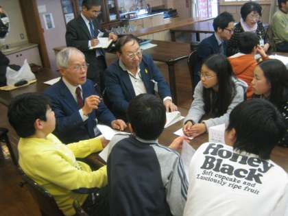 下京区の大人の方たちと一緒に会話を楽しみました。自分の将来の夢やどのような大人になりたいかなど真面目な話から,家での過ごし方,家族とのかかわり方などいろいろな話に広がっていきました。また,大人の方が自分の生き方についてを話して下さっているグループもありました。