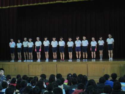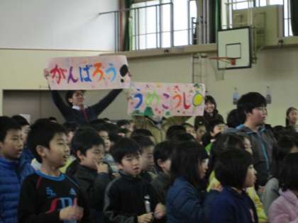 大文字駅伝の日が近づいてきました。選手は舞台に上がり,全校のみんなに意気込みを伝えました。そして,みんなからは応援の声をもらいました。