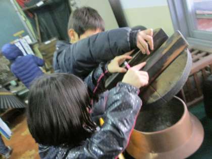 元安寧小学校に昔の道具が展示されています。3・4時間目に見学へいきました。教科書や生活の道具など,様々なものが展示されているので,子ども達は実物にふれ感動していました。「先生,これ教科書にのってたのといっしょ。」「冷蔵庫の中に氷をいれて冷やしていたんだね。」と驚いていました。