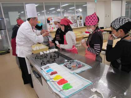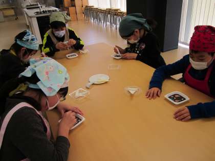 実際のパティシエの方に教わりながら,食べる絹シルクパウダー入りの砂糖やチョコでアイシングアート作品をつくりました。普段食べているチョコレートとはちがうカカオ本来の味にも親しみながら,子どもたちも真剣に作品をつくっていました。絹とチョコレートとのつながりに,子どもたちもはじめは「??」でしたが,絹をパウダーにすることで食品にも活用できることを知りました。お家でも美味しく頂いてほしいと思います。