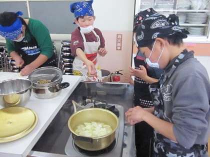 具は大根と小松菜,油揚げを切って入れました。いちょう切りにするはずの大根がなかなか薄く切れずに苦労していました。お家でお手伝いをしている人はやっぱり手際がよいようです。油揚げを上手に短冊切りにしていました。できあがったお味噌汁に普段あまり食べない子どもたちもおかわりをしていました。どのグループもお鍋が空になりました。