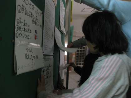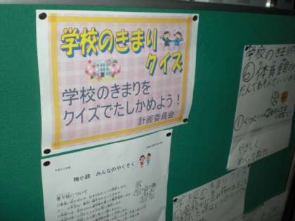 学校が初めての1年生に学校のきまりを知ってもらい,2〜6年生には確認の意味もこめて,職員室前に「学校のきまりクイズ」のコーナーを作りました。