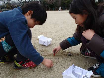 「砂鉄は運動場や砂場にあるのか。」という疑問が上がったので,みんなで砂鉄みつけをしに行きました。