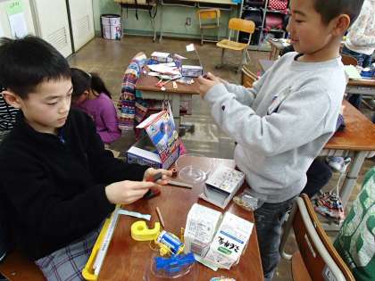これまでに学習した内容を元に,動くおもちゃを作っています。それぞれアイディアを出して楽しみながらおもちゃを作ることができました。