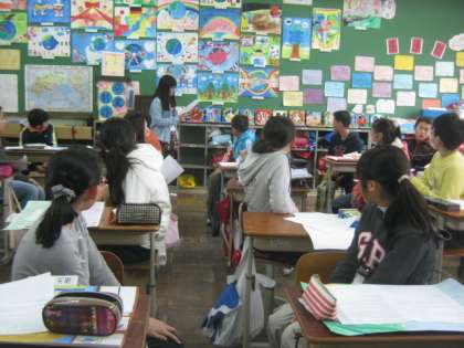 教室に掲示してある国際平和ポスターの絵を見ながら,指示棒で指し示しながらよいと思ったところの説明をしました。
