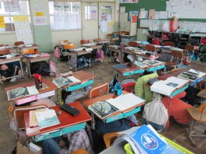 子どもたちは,緊急放送が入ると,最初動揺していましたが,放送をよく聞いて,机の下に体を入れて身をまもることができていました。
