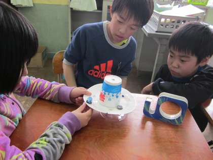 今まで学習してきたことを生かしておもちゃを作ります。じしゃくや豆電球を使って,いろいろ試しながら作る様子が見られました。なぜ明かりがつかないのかクイズやじしゃくを使っておみくじをひくものなど,子どもたちならではの発想がひかります。