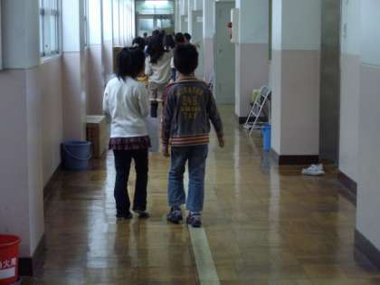 2年生の子どもたちが,1年生に学校の様子を教えながら探検する準備を進めています。「この教室は,○○室です。〜に使う部屋です。」元気のいい声が響いています。